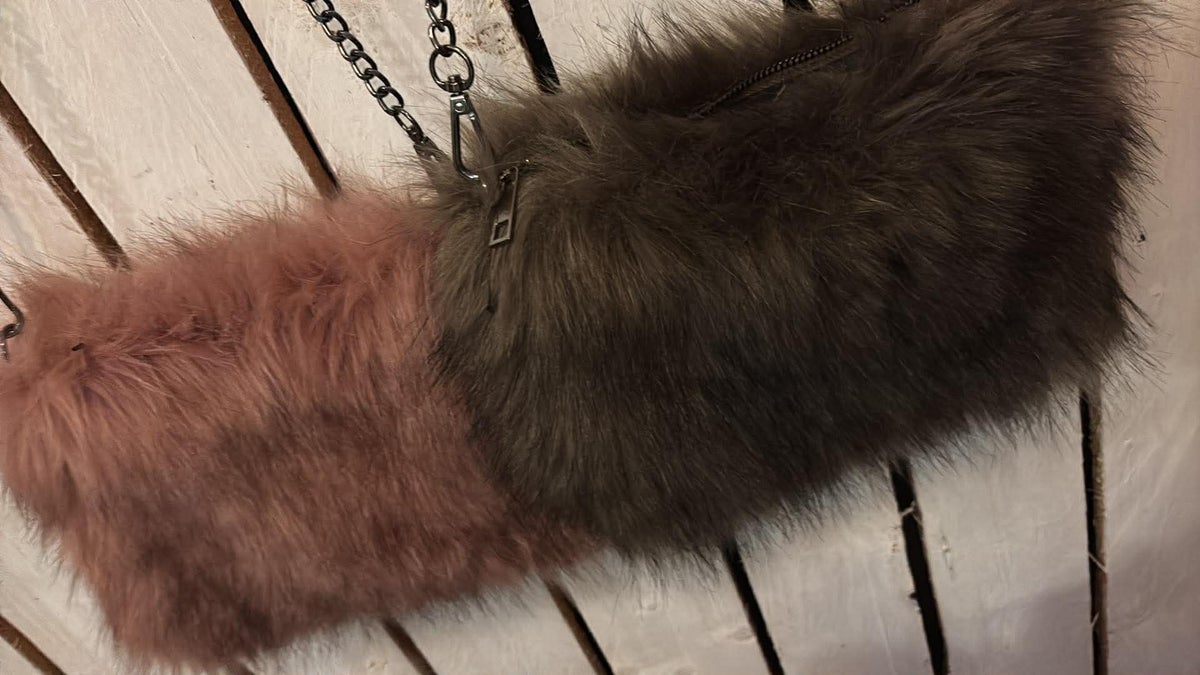 Trendikäs karvaveska , laukku , metallihihnalla ,vintage rosa ja taupe .
